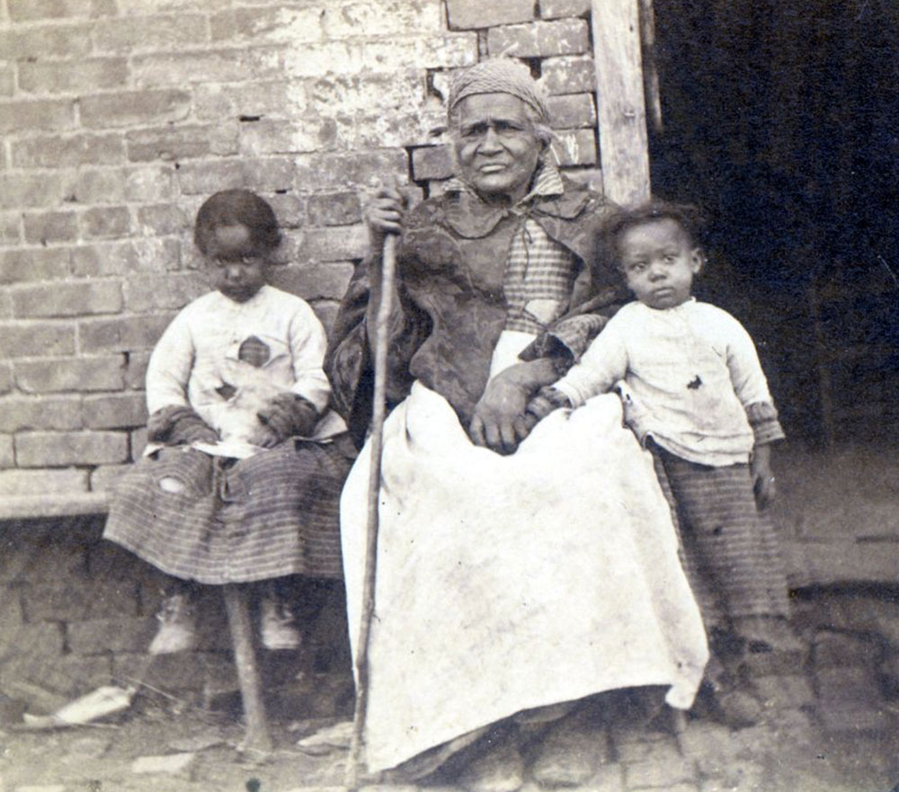 Betty Jackson in front of a slave cabin with two little girls, 1867. Source: Volunteer Voices, University of Tennessee Libraries